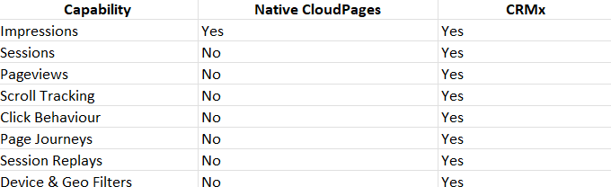 CRMx does not replace Salesforce Marketing Cloud. Instead, it extends CloudPages with behavioural visibility, filling the analytics gap left by native tracking.