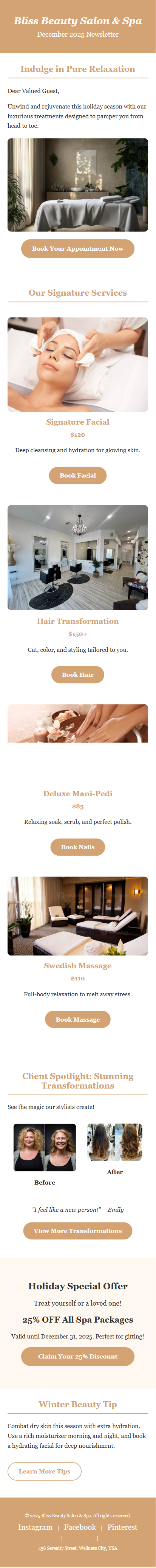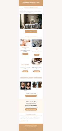 - Luxurious & On-Brand Design: Soft gold accents, serene imagery placeholders, and elegant typography capture the essence of relaxation and beauty. Perfect for showcasing facials, massages, hair transformations, mani-pedis, and holiday offers – just like a premium spa experience in your clients' inbox.