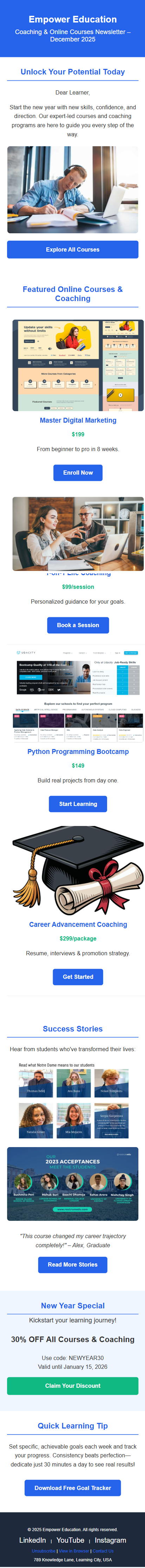 Whether you're running an online academy, personal coaching business, or corporate training program, this template helps you send professional newsletters that convert subscribers into paying students.
