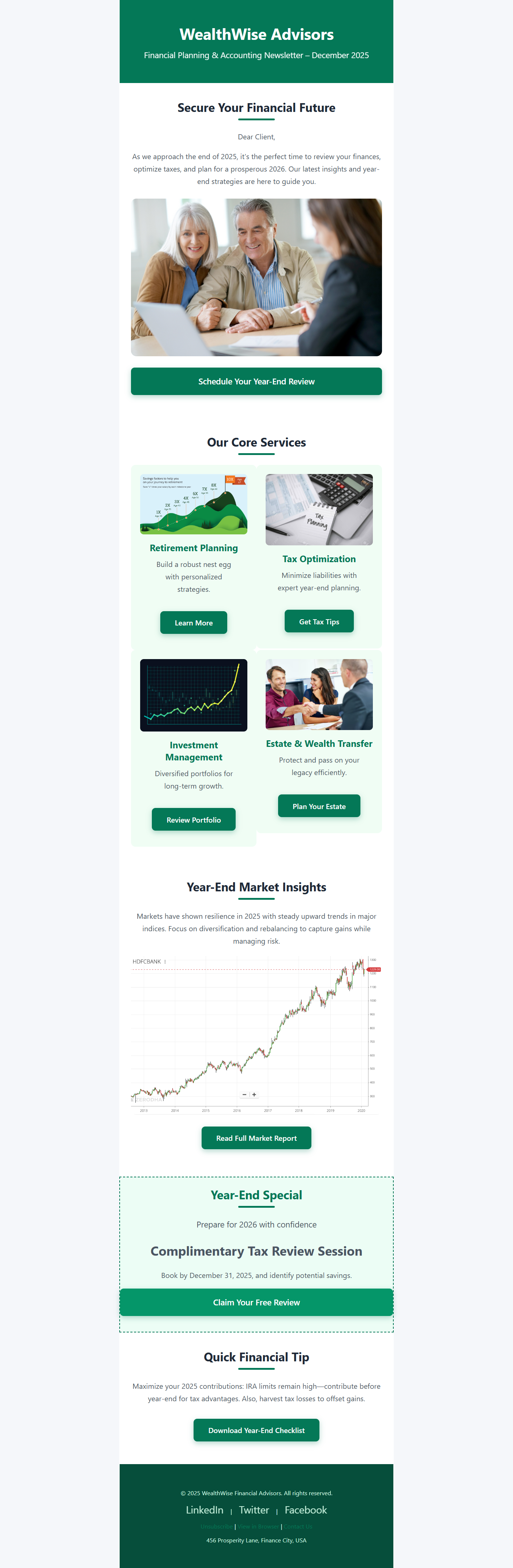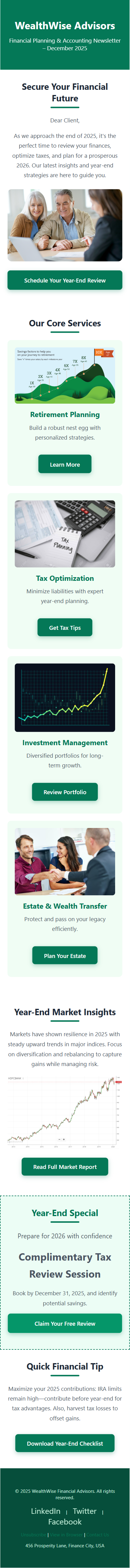 - Professional & Trust-Building Layout: Clean green-and-white color scheme evokes trust, stability, and growth. Includes sections for hero messaging, core services showcase (retirement planning, tax optimization, investment management, estate planning), market insights with charts, special offers, and quick tips-mirroring real-world financial newsletters.
